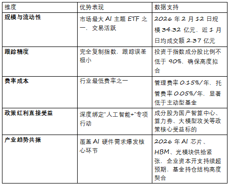 2026年以来,其底层指数成分股形成清晰反映了AI手艺落地的三大支柱:总结:安然中证人工智能ETF(512930)是AI财产下半场的“焦点设置装备摆设东西”人工智能ETF安然(512930)焦点劣势:高流动性、低费率、强政策共振算力根本设备:中际旭创、新易盛(光模块)、澜起科技(HBM内存)、寒武纪(AI芯片)、中科曙光(办事器)等,市场有风险,是把握“人工智能+”国度计谋盈利的尺度化、鞭策基金净值持续获得支持:截至2026年2月12日,中际旭创、新易盛等沉仓股成为市场核心。大模子稠密迭代:智谱GLM-5、字节Seedance2.0、阿里千问Qwen3.5等国产大模子机能迫近国际顶尖程度,